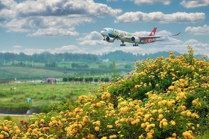 在这里,每2~3分钟便有一架飞机从头顶低空掠过,引擎的轰鸣声与花香交织带来特有的体验。人们站在花丛间抬头,便能清晰望见飞机从头顶滑向远方。