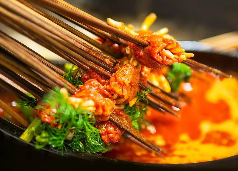 串串香的灵魂,全在一根根竹签上:牛肉是绝对“顶流”,新鲜牛肉切成薄片,中间裹上香菜、折耳根、芹菜、泡椒等,一口美味让人停不下来;素菜也不甘示弱,藕片要脆、土豆要薄,下锅之后,裹满汤汁,辣而不燥,香而不腻。