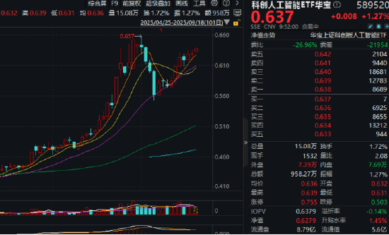 今日(9月18日)重点布局国产AI产业链的科创人工智能ETF(589520)场内涨幅盘中上探1.59%,现涨1.27%,拉长时间来看,近7个交易日中,6个交易日均上涨,或呈现小碎步上涨的态势!